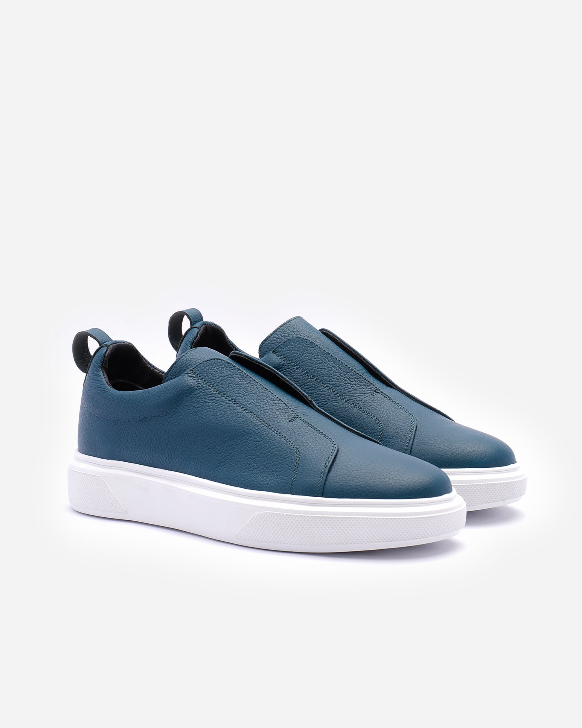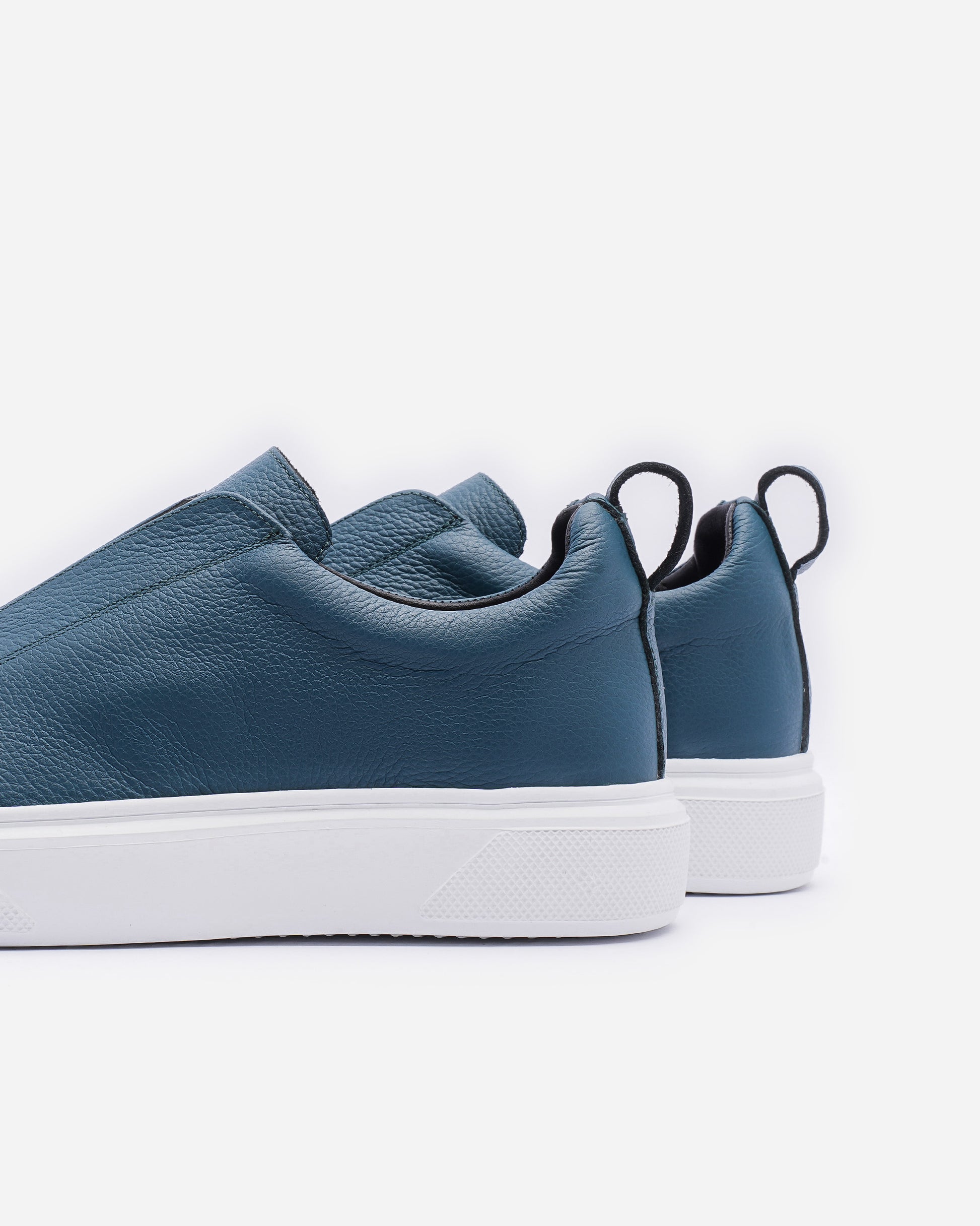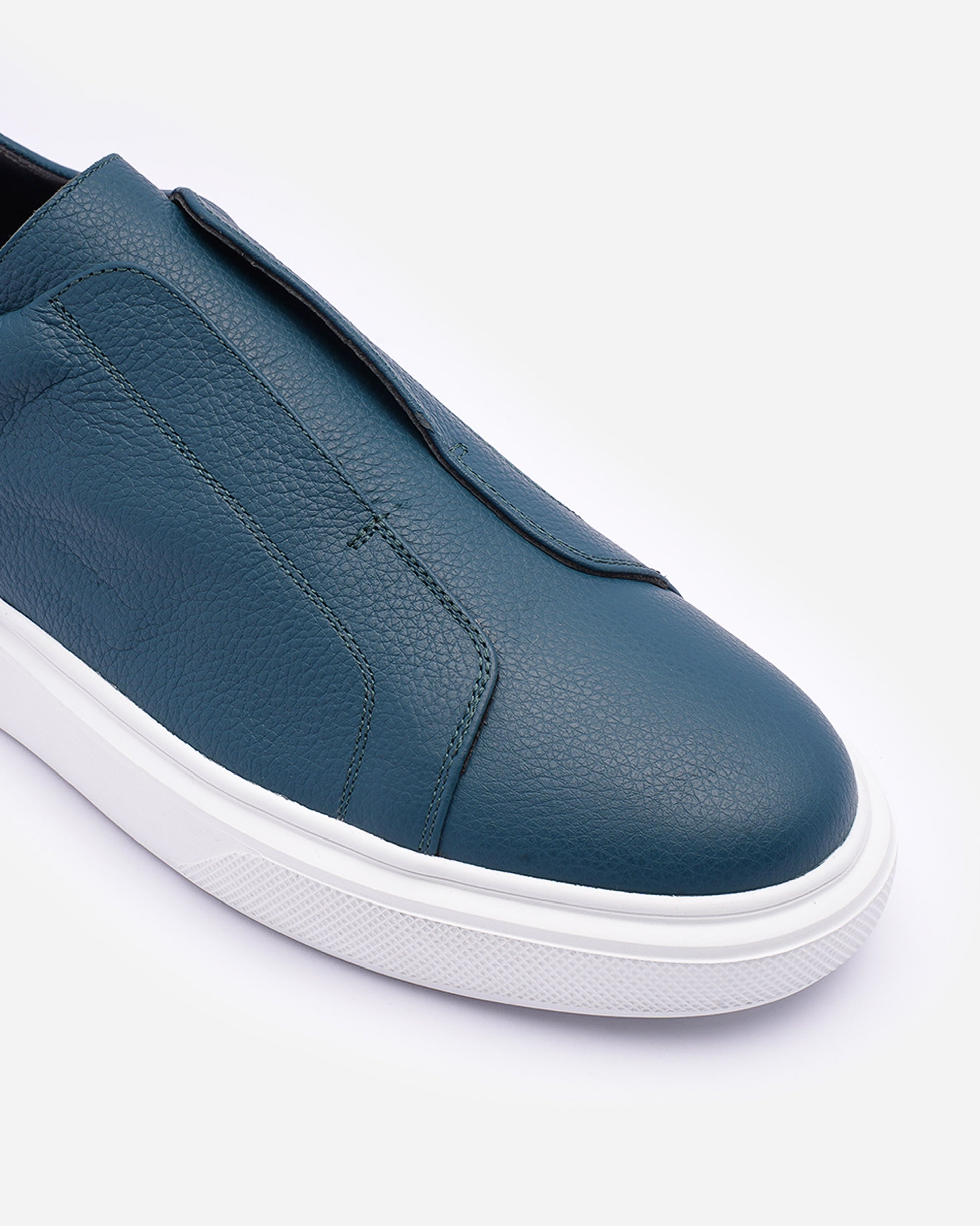 chaussure sans lacets en cuir grainé bleu profond, avec doublure douce et semelle blanche contrastée. Minimaliste et confortable, elle allie style contemporain et élégance urbaine.